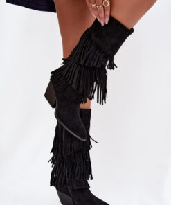 Laarzen met cowboylaarzen voor dames gemaakt van zacht imitatiesuède zijn een model dat comfort en modieuze, opvallende stijl combineert. Ze onderscheiden zich door hun karakteristieke puntige neuzen en stabiele, afgesneden hakken, die het silhouet lichtheid geven en het vrouwelijke karakter benadrukken. Decoratieve franjes op de schacht geven het geheel een dynamische uitstraling en voegen een vleugje vrijheid toe in boho-stijl. De binnenkant van de schoenen is gevoerd met een schoenendeken, wat comfort en warmte biedt op koelere dagen, waardoor ze een ideale keuze zijn voor het herfst-winterseizoen. Gesloten met een rits. Modieuze details maken deze laarzen perfect voor zowel dagelijkse, casual outfits als in combinatie met een jurk of rok, waardoor de styling een bijzonder karakter krijgt.