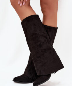 Ingeschoven cowboylaarzen van imitatie suède, met een hak in de vorm van een paal, zijn een combinatie van comfort en stijl. De puntige neuzen voegen elegantie toe, en de schacht versierd met franjes voegt een lichte, boho accent toe. Ideaal voor casual outfits, ze passen perfect bij jurken, rokken en broeken, waardoor elke creatie een vleugje cowboy-charme krijgt.
