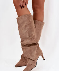 Dameslaarzen gemaakt van zacht imitatiesuède zijn een elegante en vrouwelijke keuze voor koelere dagen. Het model op een slanke hak benadrukt prachtig de benen, terwijl de puntige neus een chique uitstraling toevoegt en de silhouet optisch verslankt. De geplooide, losse schacht geeft het geheel een modieus karakter. De schoenen zijn instappers en gevoerd met een voering, waardoor ze comfort en warmte bieden. Het is een zeer stijlvol model dat zowel elegante jurken als casual outfits met jeans perfect aanvult, waardoor een modieuze en vrouwelijke look ontstaat.