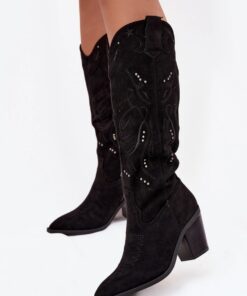 Dames cowboylaarzen gemaakt van imitatiesuède zijn een voorstel dat klassiek combineert met een modieus, uitgesproken karakter. Geplaatst op een stabiele, afgeknotte pilaarhak, voegen ze slankheid toe aan de silhouet en garanderen ze tegelijkertijd comfort tijdens het lopen. Het model valt op door decoratieve stiksels en subtiele gouden elementen. Amandelvormige neuzen benadrukken de vrouwelijke stijl, en de praktische rits aan de onderkant van de schacht vergemakkelijkt het aantrekken. Deze laarzen zijn ideaal voor herfst-winterse looks, ze passen perfect bij zowel aansluitende broeken als boho-jurken.