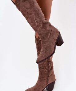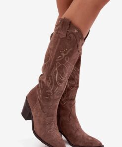 Dames cowboylaarzen, gemaakt van imitatiesuède, zijn een voorstel dat klassiek combineert met een modieus, expressief karakter. Geplaatst op een stabiele, afgeknotte pilaarhak voegen ze slankheid toe aan de silhouet en garanderen tegelijkertijd comfort tijdens het lopen. Het model onderscheidt zich door decoratieve stiksels en subtiele gouden elementen. Amandelvormige neuzen benadrukken de vrouwelijke stijl, en de praktische rits aan de onderkant van de schacht vergemakkelijkt het aan- en uittrekken. Deze laarzen zijn ideaal voor herfst- en winteroutfits, ze passen perfect bij zowel nauwsluitende broeken als boho-stijl jurken.