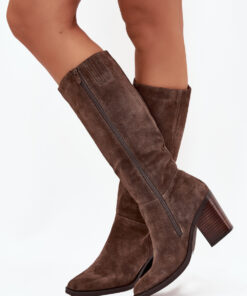 Dames laarzen gemaakt van natuurlijk suède, met een hak in de vorm van een pilaar, zijn een combinatie van elegantie en comfort. Met een rits, zorgen ze voor gemakkelijk aan- en uittrekken en een goede pasvorm. De afgeronde neuzen garanderen comfort gedurende de hele dag. Deze laarzen passen perfect bij jurken, rokken of broeken en voegen stijl en klasse toe aan elke outfit.