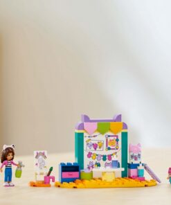 LEGO Gabby’s poppenhuis Knutselen met Babykitty (10795) is fantasiespeelgoed voor kinderen, ontworpen om creatieve vaardigheden te ontwikkelen en fantasierijk spel te stimuleren. Deze poppenhuisset voor kinderen zit vol kleur, bekende personages en leuke kenmerken die fans van Gabby’s poppenhuis van DreamWorks Animation zullen herkennen en waarderen. Dit LEGO speelgoed voor kinderen bevat een imitatiekwast, verf, schaar en een spuitbus, plus een Gabby minipoppetje en een figuur van Babykitty. Samen schilderen Gabby en Babykitty een schilderij en bouwen ze een model van Gabby’s poppenhuis. Er is zelfs een ladder waarmee de personages de top van het model kunnen bereiken. De muur is bedekt met kunst en aan de bovenkant van het model steken twee kattenoren uit. De set zit boordevol boeiende details en wordt geleverd met een startsteen om kinderen op weg te helpen. Met intu?tieve bouwinstructies in de vorm van een kleurrijk stripverhaal. 60-delig. Geschikt vanaf 4 jaar.