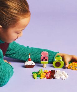 Deze set voor beginners biedt eindeloze mogelijkheden om te bouwen, te herbouwen en vrij bouwplezier te ontdekken en ondersteunt het zelfvertrouwen, de concentratie en het probleemoplossend vermogen van jonge kinderen. Kinderen gebruiken de kleurrijke bouwstenen en speciale onderdelen zoals ogen, monden en decoratieve elementen om 4 schattige etensvriendjes te bouwen: een cupcake, een ijsje, een avocado en een taco. Daarna kunnen ze de stenen combineren en de modellen ombouwen tot een taart met hagelslag, bubbelthee, een peer en een tosti. Naarmate kinderen meer zelfvertrouwen krijgen, kunnen ze de intuïtieve bouwhandleiding volgen om uitdrukkingen, vormen of kleuren te veranderen en nieuwe etensvriendjes te maken, waaronder een groen ijsje, een pakje sap, een schijf watermeloen, een chocoladereep en een megabroodje. Geschikt voor kinderen vanaf 4 jaar.