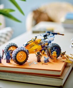 Jongens en meisjes kunnen spannende scènes uit seizoen 2 van de tv-serie NINJAGO Dragons Rising naspelen met LEGO NINJAGO Arins ninjaterreinbuggy (71811). Deze avonturenset voor kinderen bevat een geel speelgoedvoertuig met bewegende wielen, vering, een cockpit die open kan met ruimte voor 2 minifiguren, 2 noppenschieters met 6 noppen om af te vuren en een grote haak aan de achterkant om schurken mee te vangen. Het ninjaspeelgoed wordt geleverd met een model van baby Riyu en 4 NINJAGO minifiguren: klimmer Cole met klimhaak en katana, Arin met klimhaak en katana, een Wolvenmasker klauwstrijder met klauwen en Cinder met een zwaard. De rest van het LEGO NINJAGO assortiment bouwbaar ninjaspeelgoed omvat mecha, draken en tempels, zodat fans de actie kunnen naspelen met hun helden (sets worden apart verkocht). Elke ninjaspeelset kan worden gemaakt met behulp van de LEGO Builder app, die jou en je kind begeleidt op een eenvoudig en intuïtief bouwavontuur. 267-delig. Geschikt vanaf 7 jaar.