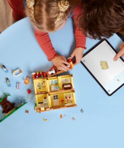 Het modulaire speelhuis bevat 4 Bluey poppetjes van Bluey zelf, Bingo, Chilli (Bluey’s moeder) en Buster (Bluey’s vader) en accessoires voor rollenspellen, waaronder een regenboogcape, toverstaf en vergrootglas. Alle kamers zijn uitneembaar. In de speelkamer staan een poppenhuis, piano en kraampje met speelgoed eten. De keuken heeft een koelkast, oven, fornuis, tafel en stoelen. Boven is de slaapkamer van mama en papa en een badkamer. De slaapkamer van Bluey en Bingo op zolder heeft een kleed, een lamp en een speelgoed dieren figuur van Babbel-uil. Naast de deur staat de troon van de koningin, compleet met theepot, kopje en kikker. In de tuin vind je een grote boom, hotdog, pizza, waterkraan, Gerritje en een ballon. Lego sets voor kinderen vanaf 4 jaar bevatten kleurrijke instructies en startstenen, zodat het bouwplezier snel kan beginnen. Dit Bluey speelgoed voor kinderen van 4 jaar en ouder is een fantastisch cadeau voor meisjes, jongens en fans van de Bluey tv-serie.