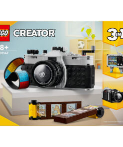 Deze klassieke speelgoed camera heeft een beweegbare lens, knoppen aan de bovenkant, een achterkant die open kan om een stuk film te plaatsen en een kleurrijke draagriem van textiel. Er zijn ook 6 stickers die kinderen aan de film kunnen toevoegen als ‘foto’s’. Met deze Creator 3in1 retro speelgoed set krijgen kinderen 3 verschillende bouw- en speelervaringen met dezelfde stenen. Ze kunnen een fotocamera bouwen en deze vervolgens ombouwen tot een retro videocamera of een klassieke speelgoed televisie met antenne. Alle 3 de modellen zien er prachtig uit op een plank in de kinderkamer als decoratie. Creator 3in1 speelgoed is een geweldig cadeau met 3 mogelijkheden in elke doos. Kinderen zullen de modellen graag bouwen, herbouwen en opnieuw bouwen. De 3in1 sets sluiten aan op hun interesses, waaronder supersnelle voertuigen, geweldige dieren en gedetailleerde stadstaferelen. Bevat 261 onderdelen. Geschikt voor kinderen vanaf 8 jaar.