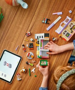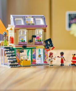 Met dit speelgoedwinkel en appartement bouwpakket voor kinderen raak je altijd de juiste snaar. HetLego Friends 42653 Muziekwinkel en Appartement speelgoed voor kinderen van 7 jaar en ouder bevat 3 Friends poppetjes en een speelgoed dieren figuur van een corgi, plus accessoires voor fantasierijke rollenspellen. Kinderen kunnen muziek maken met Friends personages Paisley, Zac en Elsa D terwijl ze alle verschillende instrumenten in de winkel uitproberen, waaronder een drumstel, een gitaar en een saxofoon. Er is ook een piano waar Marimba de corgi op geplaatst kan worden om in de microfoon te ‘zingen’. Het felgekleurde gebouw heeft een leuke afneembare mascotte in de vorm van muzieknoten die aan het appartement kan worden bevestigd en een trap met pianotoetsen die naar het gezellige appartement van Elsa D leidt. Het appartement heeft leuke details, waaronder een hondenluik, hondenmand, brievenbus, speelgoed keukentje, bureau en een hoogslaper met ladder. Deze gedetailleerde set bevat ook veel accessoires zoals een platenspeler, synthesizer en koptelefoon, waarmee kinderen verschillende sociale situaties kunnen naspelen met de Friends minifiguren. Deze set is een leuk cadeau voor meisjes en jongens die dol zijn op bouwen en fantasierijk spel.