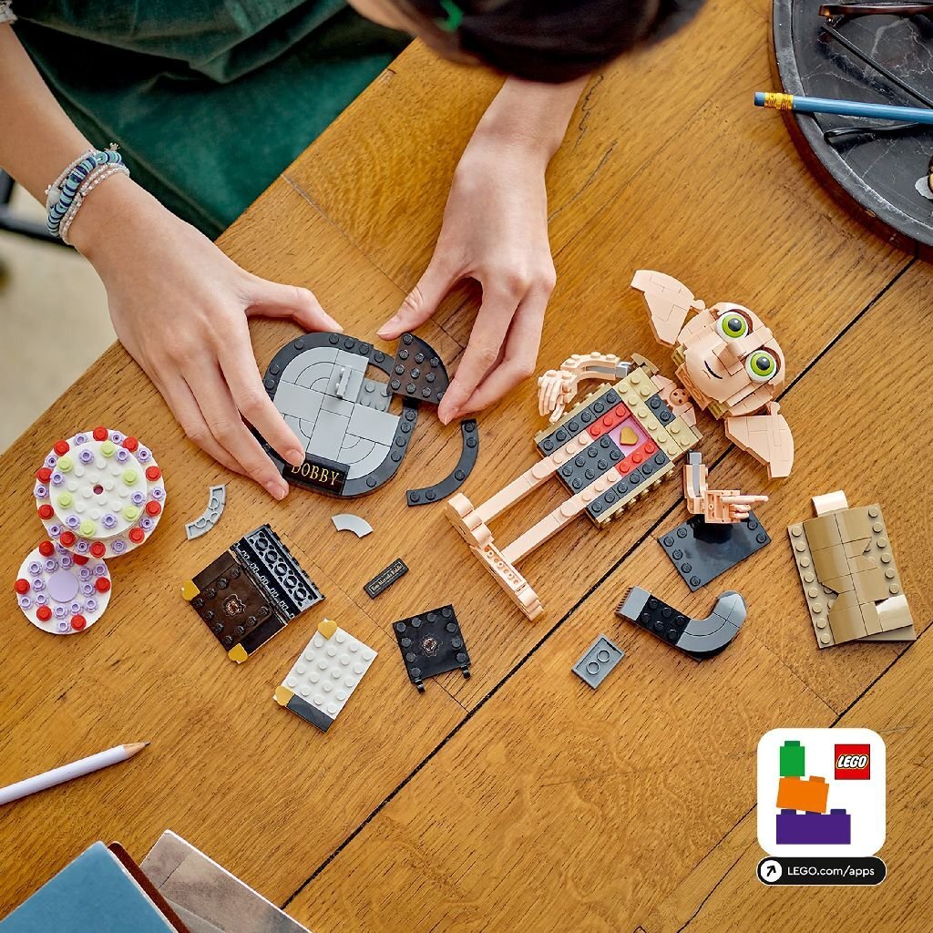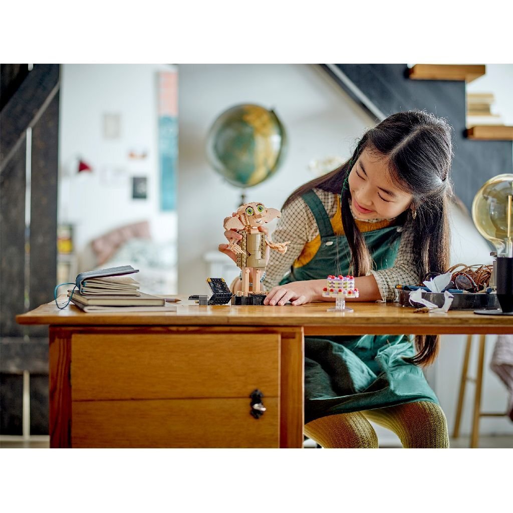 De direct herkenbare figuur heeft een beweegbaar hoofd en verstelbare armen en vingers zodat Dobby de meegeleverde accessoires kan vasthouden. Er is een gedetailleerd bouwbaar model van Harry Potters sok met het dagboek van Marten Vilijn dat Harry gebruikte om Dobby te bevrijden en tante Petunia’s ‘zwevende’ taart om herinneringen aan klassieke scènes op te roepen. Dit bouwbare displaymodel van Dobby de huis-elf is ca. 19 cm hoog en vormt een magisch cadeau voor kinderen en verzamelaars van Harry Potter memorabilia. Plaats de figuur van Dobby op de bouwbare standaard met naamplaatje om de blikvanger af te maken en de aandacht van elke voorbijganger te trekken. Gun je kind een eenvoudig en intuïtief bouwavontuur met de Builder app. Hiermee kun je inzoomen en modellen in 3D draaien, sets opslaan en de voortgang bijhouden. 403-delig. Geschikt voor kinderen vanaf 8 jaar.