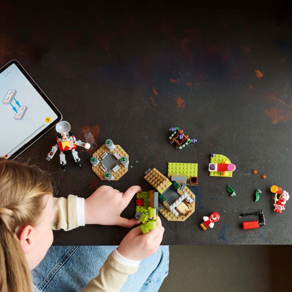 Het Lego Sonic the Hedgehog verzamelspeelgoed bestaat uit een tempel met 4 Chaos Emeralds, een verblijf voor Knuckles met trainingsruimte onder het heiligdom, een draaiende vloer en een wijnrank, Amy’s hamer en een katapult om druiven richting de Eggrobo te schieten. Het bevat 4 personages: minifiguren van Knuckles en Amy, een verstelbare Eggrobo Badnik met een jetpack en noppenschieter en een Picky. Deze Sonic speelset is speelgoed waarmee fans samen met Knuckles en Amy verhalen kunnen bedenken: van sporten en druiven oogsten tot het verdedigen van het heiligdom en de Chaos Emeralds. Kinderen kunnen de Eggrobo verslaan, de Picky redden en zich daarna ontspannen met een lekkere snack. Kinderen kunnen ook genieten van een intuïtief bouwavontuur met de Builder app. Hiermee kunnen ze inzoomen en hun modellen draaien, sets opslaan en hun voortgang bijhouden. 325-delig. Geschikt voor kinderen vanaf 8 jaar.