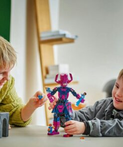 Het bouwbare Marvel Fantastic Four speelgoed is inclusief 4 minifiguren: Mr. Fantastic met uitschuifbare benen, Human Torch met 2 handblasters, vlamelementen aan zijn voeten en een transparante steun waarmee hij kan ‘vliegen’, Invisible Woman met 2 krachtschilden en The Thing met zijn grote, krachtige handen. De volledig verstelbare bouwfiguur van de schurk uit de film, Galactus, is ca. 28 cm hoog en zorgt voor eindeloos actiespel. Voor digitaal plezier kunnen bouwers inzoomen, modellen in 3D draaien en de voortgang bijhouden met de leuke, intuïtieve Builder app. De set bevat 427 onderdelen. Geschikt voor kinderen vanaf 9 jaar.