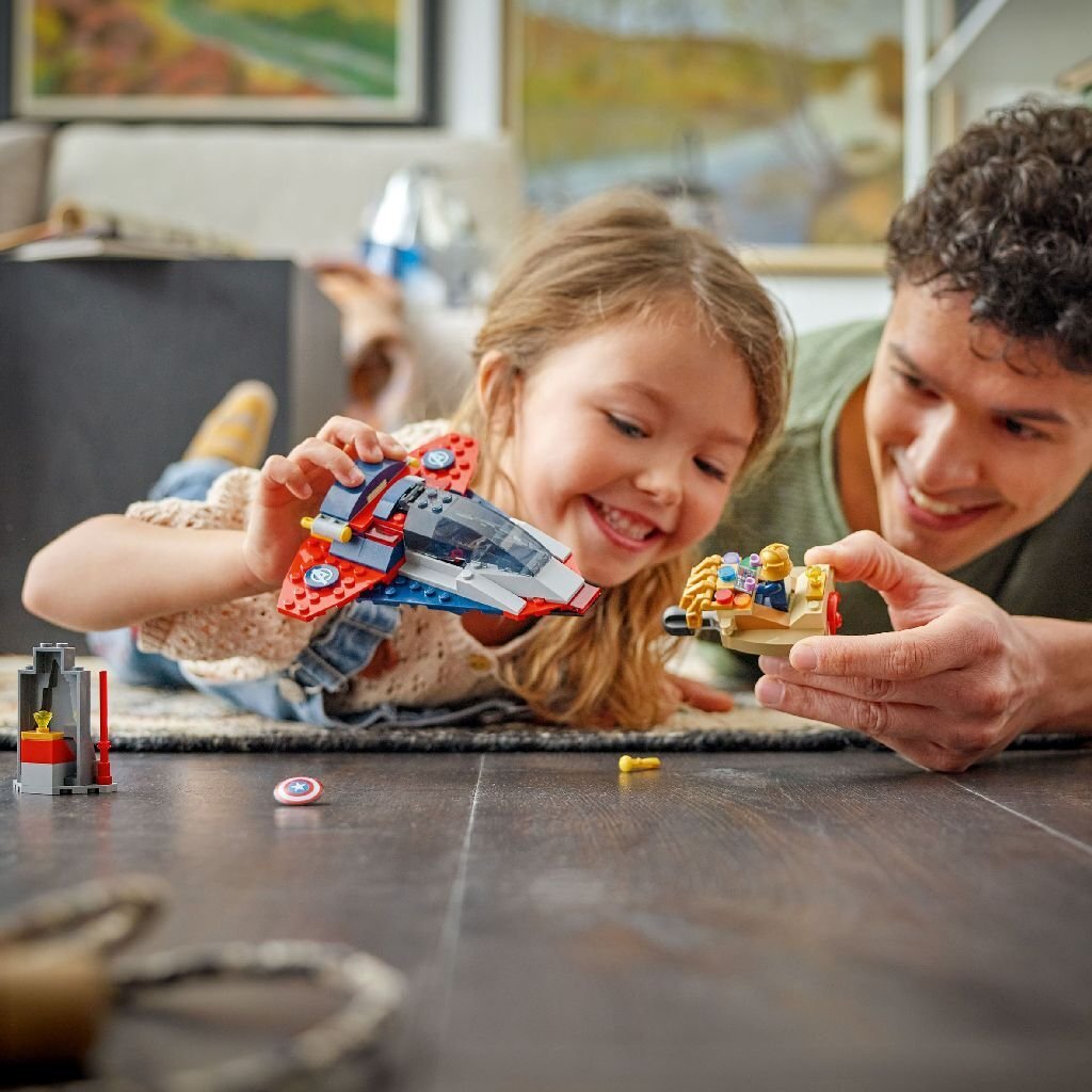 Dit bouwspeelgoed voor jongens en meisjes bevat ruimteschepen en Marvel minifiguren en is een leuk cadeau voor elke gelegenheid. De bouwset bevat 2 minifiguren: Thanos in een ruimteschip dat op de Infinity Gauntlet lijkt met beweegbare ‘vingers’ en een schieter en Captain America in een Quinjet met 2 schieters, een cockpit die open kan en een verborgen vak voor zijn schild. Een klein model met een kostbare steen inspireert creatieve verhalen waarin Captain America probeert te voorkomen dat Thanos de edelsteen steelt. Elk zakje stenen in de doos bevat een grote startsteen voor een eenvoudig te bouwen model en een personage, zodat het spelen snel kan beginnen. Inclusief een boekje met intuïtieve instructies. De set bevat 107 onderdelen. Lego sets voor kinderen vanaf 4 jaar zijn een ideale manier voor volwassenen om leuke en leerzame momenten te beleven met hun jonge kind.