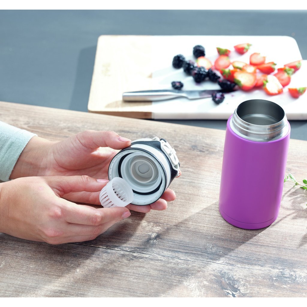 Als je op zoek bent naar een lekvrije thermobeker die je veilig in je zak kunt meenemen, dan is de Flip isoleerbeker van Leifheit de juiste keuze.Omdat deze verschillende veiligheidsfuncties heeft die voorkomen dat de inhoud lekt: het deksel is voorzien van een sluiting die 100% lekvrij is.Het slot voorkomt dat het deksel van de isolerende beker vanzelf opengaat.Hij kan dus gemakkelijk overal mee naartoe worden genomen.De drukknop is ook bijzonder praktisch voor onderweg.Hierdoor is het mogelijk om de beker met één hand te openen – en zonder hem neer te hoeven leggen.Het filterelement in het deksel voorkomt dat kruiden, fruit en dergelijke het drinken verstoren.Het filter kan van het deksel worden losgeschroefd en gemakkelijk grondig worden gereinigd.Uiteraard is de beker niet alleen geschikt voor koffie-to-go en andere warme dranken, maar ook voor coole dingen.Dankzij de dubbelwandige isolatie van roestvrij staal houdt het koude dranken tot 18 uur aangenaam koel en warme dranken tot6 uur warm.