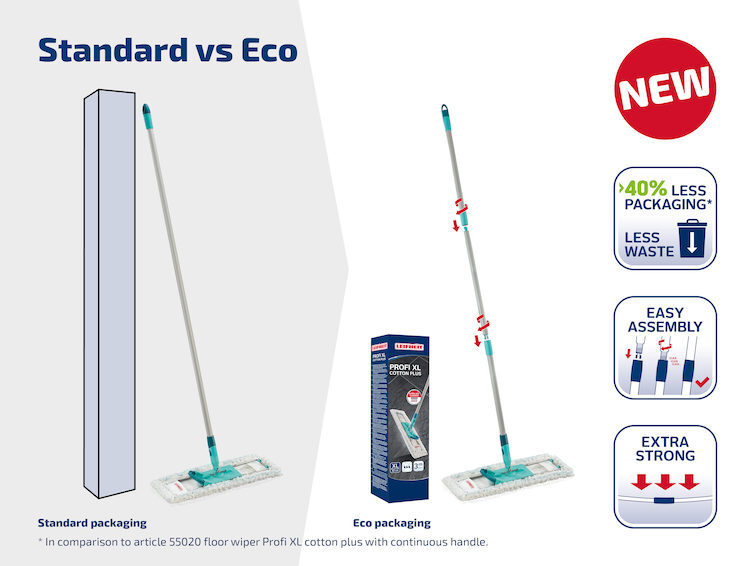 • Milieuvriendelijke verpakking – dankzij de stevige 3-delige steel heeft de mop 40% minder verpakking nodig dan zijn voorganger en vermindert daardoor het verpakkingsafval