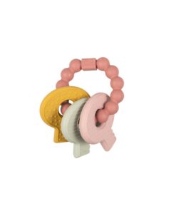 De komst van de eerste tandjes is een mijlpunt voor jouw baby, maar niet altijd even prettig! Om de pijn te verlichten heeft Little Dutch een multifunctionele bijtring ontworpen in de vorm van een sleutelbos. Het is een speeltje maar biedt ook troost en helpt de nieuwe tandjes door te komen. Het bijtspeeltje heeft verschillende texturen waardoor jouw baby genoeg te ontdekken heeft. Speciaal ontworpen dat het makkelijk vast te pakken is voor baby handjes! In zachte aardetint, zand en roze. Geschikt voor kinderen vanaf 4 maanden.