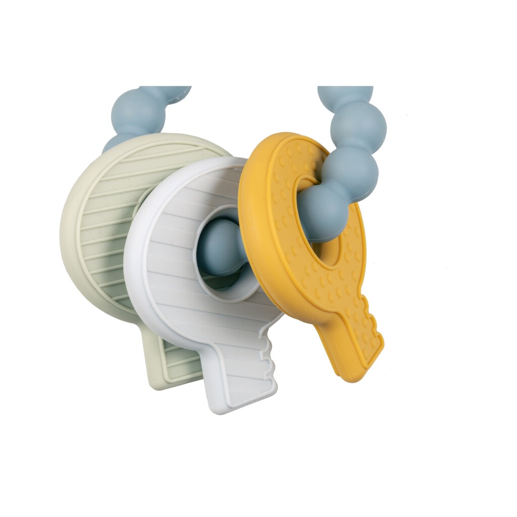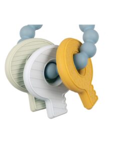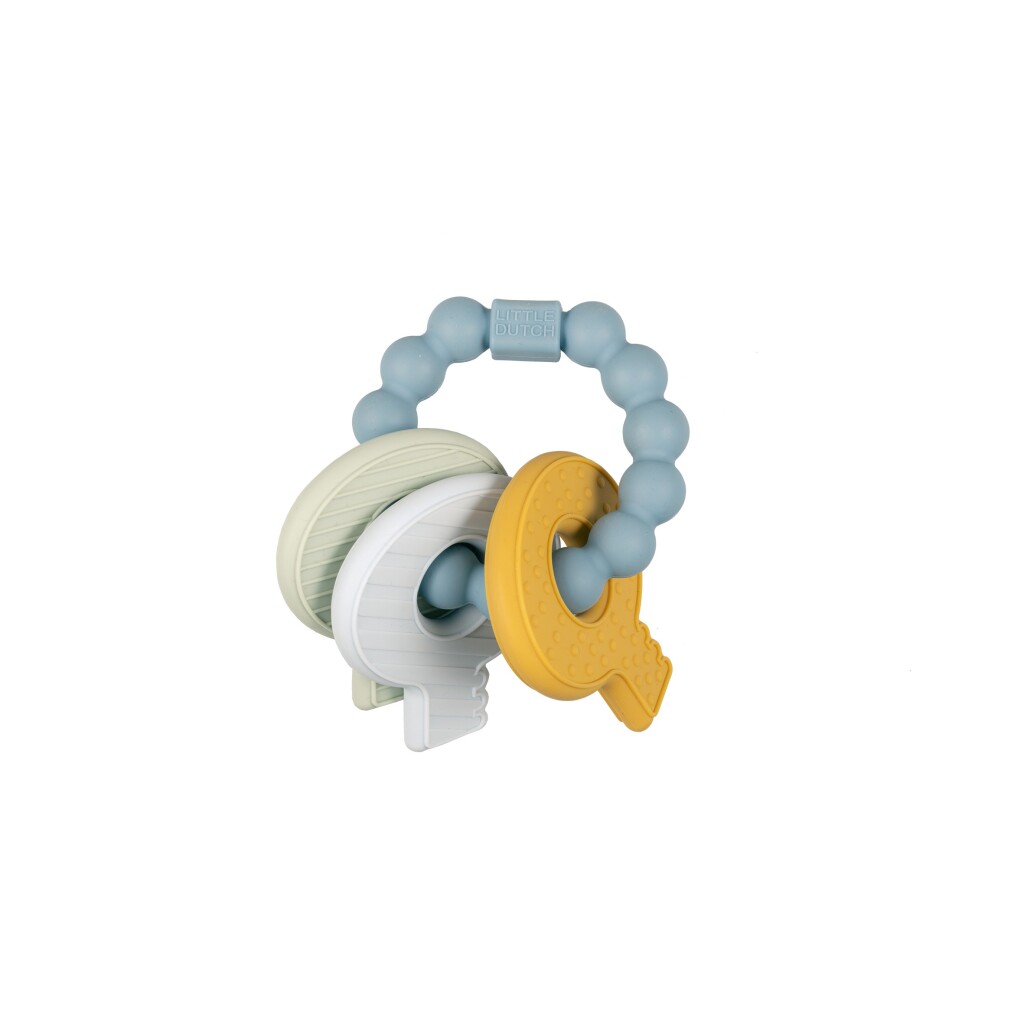 De komst van de eerste tandjes is een mijlpunt voor jouw baby, maar niet altijd even prettig! Om de pijn te verlichten heeft Little Dutch een multifunctionele bijtring ontworpen in de vorm van een sleutelbos. Het is een speeltje maar biedt ook troost en helpt de nieuwe tandjes door te komen. Het bijtspeeltje heeft verschillende texturen waardoor jouw baby genoeg te ontdekken heeft. Speciaal ontworpen dat het makkelijk vast te pakken is voor baby handjes! In zachte tinten blauw, zand en groen. Geschikt voor kinderen vanaf 4 maanden.