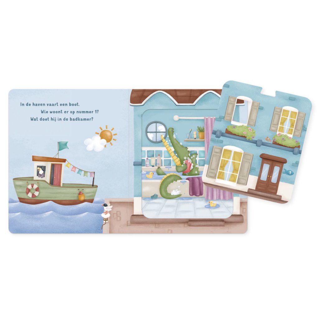 In dit puzzelboek is van alles te zien en te tellen. Wie wonen er in de huizen op nummers 1, 2, 3, 4, en 5? Hoeveel ramen tel je in elk huis? Tel een hoeveel hondjes er aan het spelen zijn. De huizen staan steeds op een andere locatie: aan de haven, een gracht, een pleintje, een park en er is een huis met een grote tuin. Er is niet alleen buiten van alles te zien. Kijk maar door de ramen van de huizen naar binnen. Wat doen de bewoners? De puzzelstukken zijn aan beide zijden bedrukt. Als je de puzzelstukken uit het boek haalt, kun je met alle stukken ƩƩn groot huis maken. Of leg een cijfertoren met de achterkant van de stukken. Puzzel je mee?