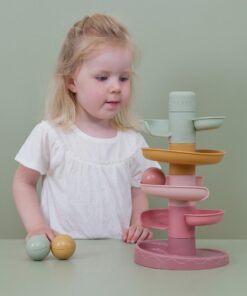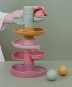 Laat de bal maar rollen! De spiraaltoren van Little Dutch zorgt voor eindeloos veel speelplezier. Deze kleurrijke set bestaat uit 5 subtiel gekleurde delen die jouw kleintje gemakkelijk op elkaar stapelt. Laat de ballen een voor een op de bovenste laag vallen en kijk hoe ze achter elkaar naar beneden rollen en slingeren. De spiraaltoren draagt bij aan de ontwikkeling van de hand-oog coördinatie en leert kleintjes over oorzaak en gevolg, waarmee het zowel leuk als leerzaam spelen is. Bij de spiraaltoren zitten standaard 3 lichte en gemakkelijk vast te pakken ballen in verschillende kleuren die bij beweging een geluidje maken. Dit speelgoed is uitgevoerd in de kenmerkende Little Dutch kleuren oudroze, roze, lichtroze, groen en okergeel. De afmeting is: 18 x 18 x 30 cm. Geschikt voor kinderen vanaf 18 maanden.