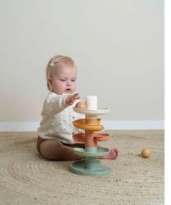 Laat de bal maar rollen! De spiraaltoren van Little Dutch zorgt voor eindeloos veel speelplezier. Deze kleurrijke set bestaat uit 5 subtiel gekleurde delen die jouw kleintje gemakkelijk op elkaar stapelt. Laat de ballen een voor een op de bovenste laag vallen en kijk hoe ze achter elkaar naar beneden rollen en slingeren. De spiraaltoren draagt bij aan de ontwikkeling van de hand-oog coördinatie en leert kleintjes over oorzaak en gevolg, waarmee het zowel leuk als leerzaam spelen is. Bij de spiraaltoren zitten standaard 3 lichte en gemakkelijk vast te pakken ballen in verschillende kleuren die bij beweging een geluidje maken. Dit speelgoed is uitgevoerd in de kenmerkende Little Dutch kleuren oudroze, roze, lichtroze, groen en okergeel. De afmeting is: 18 x 18 x 30 cm. Geschikt voor kinderen vanaf 10 maanden.