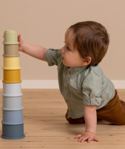 1,2,3 hoe hoog wordt de toren?! Deze set met bekers daagt je peuter uit om ze één voor één op elkaar te stapelen. Hoe groot zal de vreugde zijn als de toren helemaal staat! En hoe leuk is het om de toren weer om te gooien! Uren speelplezier gegarandeerd. Met de vier vrolijke tinten zullen de bekers je kleintje zeker vermaken. De 8 stapelbekers hebben een nummer aan de bovenkant en passen gemakkelijk in elkaar om te voorkomen dat de toren te snel valt. Je kleintje leert over cijfers en ontwikkelt fijne motoriek. Stapel en maak de toren in de box, op de vloer of in de badkuip of zandbak. Dankzij het veelzijdige materiaal kan het overal worden gebruikt. Plaats de kleine bekers in elkaar om ze eenvoudig op te bergen. De toren bestaat uit 8 stapelbekers, variërend in diameter tussen 6 en 9,5 cm en de toren is in totaal 43 cm hoog als je alle bekers op elkaar zet. Geschikt voor kinderen vanaf 6 maanden.