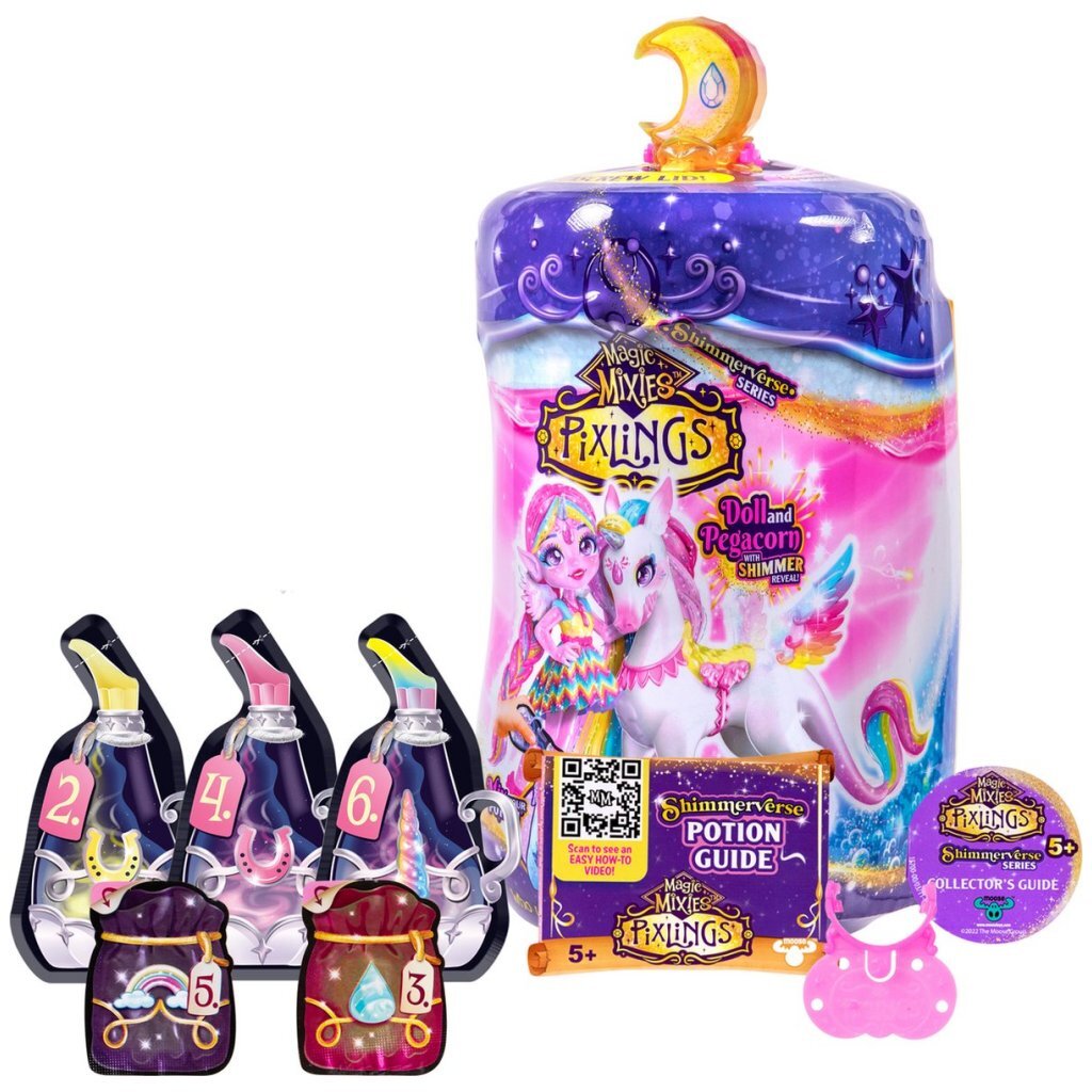 Betreed het Betoverde Rijk van de Magic Mixies Pixlings, waar toverdrankjes uit watervallen en fonteinen stromen. Nu is het jouw beurt om een Magisch Toverdrankje te maken en jouw Magic Mixies Pixling en haar gevleugelde Unicorn te onthullen! In de fles vind je alle ingrediĆ«nten om ze tevoorschijn te toveren. Maak het Toverdrankje door de stappen nauwkeurig te volgen. Het drankje zal borrelen en een glinsterend, wervelend donkerblauw mengsel worden. Zeg dan de magische woorden “Magicus Mixus”, terwijl je de kristallen edelsteen draait en indrukt. Het drankje wordt helder en op magische wijze worden een prachtige regenboog Pixling en haar gevleugelde Unicorn Rainbow Star onthuld! Dat is dubbel zoveel plezier in ƩƩn magisch drankje! De Regenboog Pixling heeft een kristallen edelsteen op haar voorhoofd en heeft altijd haar trouwe Unicorn Rainbow Star aan haar zijde. Je Pixling is 18,5 cm lang en heeft 7 beweegpunten zodat je haar gemakkelijk op haar vliegende vriend kunt zetten. Ze is prachtig gedetailleerd en heeft lang gevlochten haar in vele kleuren, draagt een modieuze jurk en handgemaakte schoenen. Style haar prachtige lang haar zoals jij dat wilt! Geschikt voor kinderen vanaf 5 jaar.