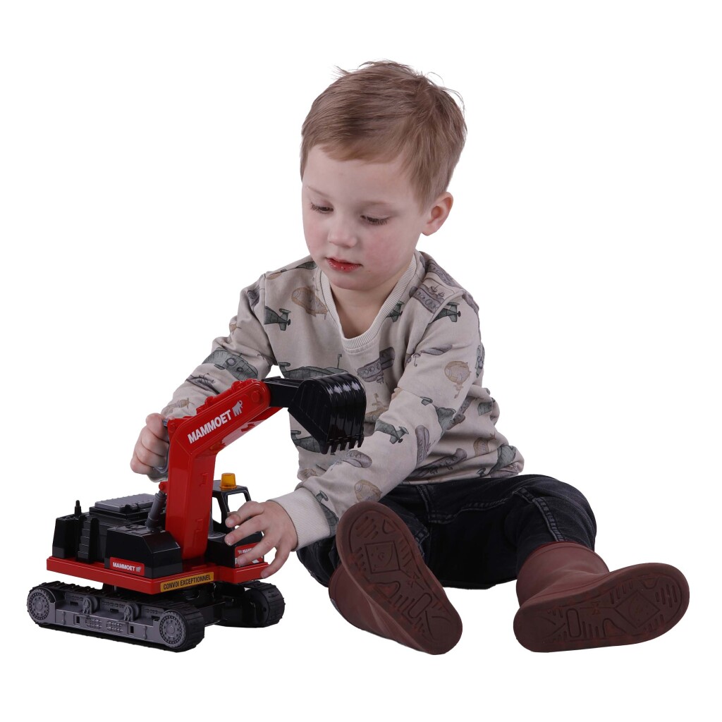 De rood-zwarte Mammoet kraan is draaibaar en bestuurbaar met de handel boven op de kraan. De Mammoet kraan is ideaal voor de kleine kraanliefhebber, staat garant voor uren speelplezier.