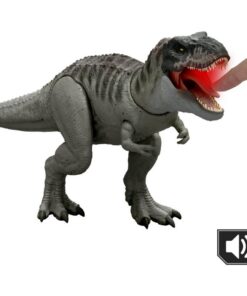 Deze Grote Verslinder Tyrannosaurus Rex, geïnspireerd op Jurassic World Rebirth, blijft woest om zich heen happen! Wanneer je de tong omlaag duwt, hoor je eerste een overwinningsbrul. Wanneer je de tong langer omlaag houdt, activeer je constante, razende bijtbewegingen met licht en geluid! Met deze functie kun je een woeste strijd aangaan met andere dinosaurusfiguren, want de T-Rex blijft happen! Met de staart laat je de kop van de dino op en neer of heen en weer gaan, met wijd geopende kaken! Scan de traceercode op de voet van de dinosaurus in de gratis Jurassic World Play app met een geschikt smart apparaat (Android of iOS, niet inbegrepen) om een digitale versie van de dinosaurus te ontgrendelen en een leuke woeste game te spelen waarin je met diverse voertuigen over land, in de lucht of over de zee gaat racen. Een geweldig cadeau voor dinofans vanaf 4 jaar. Kleuren en versieringen kunnen variëren.