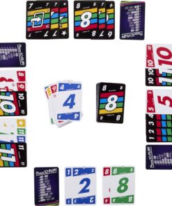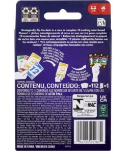 Phase 10 Flip, van de makers van UNO, zet het klassieke Phase 10 kaartspel helemaal op z’n kop! Spelers moeten nog steeds 10 fasen voltooien, maar dit keer met een paar onverwachte verrassingen, zoals dubbelzijdige kaarten en speciale FLIP-kaarten! De ene kant van de kaart bevat de standaard kleuren, maar de andere kant is de WILDE kant! De fasen in het spel draaien om kaarten van dezelfde kleur, daarom moeten de spelers strategisch spelen door de kaarten om te draaien naar de wilde kant als ze daardoor hun fasen sneller kunnen voltooien, of terugdraaien naar de gekleurde kant om hun tegenstanders te hinderen. Dit leuke gezinsspel is perfect voor spelers van 7 jaar en ouder.