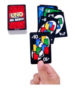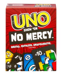 UNO Toon Geen Genade is ons wreedste UNO spel ooit! Het spel heeft veel meer kaarten met VEEL strengere straffen (pak jij even 10 kaarten?) en nieuwe regels die ervoor zorgen dat spelers meer kaarten stapelen, ruilen en pakken dan ooit tevoren! En er is zelfs een Genaderegel (ja, we snappen de ironie) als het spel te ruw wordt. Er zijn twee manieren om te winnen in deze genadeloze versie van het klassieke spel: zorg dat je alle kaarten kwijtraakt OF knal alle andere spelers uit het spel! Oh en vergeet vooral niet ‘UNO’ te roepen als je nog een kaart over hebt!