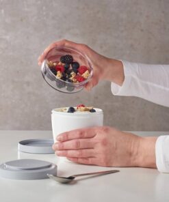De lunchpot Ellipse van Mepal is één handig product om je lunch of tussendoortje mee te nemen, maar bestaat in feite uit twee delen om de verschillende ingrediënten gescheiden te houden. Zo doe je bijvoorbeeld yoghurt in de onderste container (beker) en muesli of fruit in de bovenste container. De deksel van de onderste container is niet gelijk de bodem van de bovenste container. Beide containers hebben een aparte deksel en blijven daarom schoon. Door middel van een eenvoudige draaibeweging scheid je de twee compartimenten om de ingrediënten te mixen. Supermakkelijk en dé oplossing om geknoei tijdens het mengen