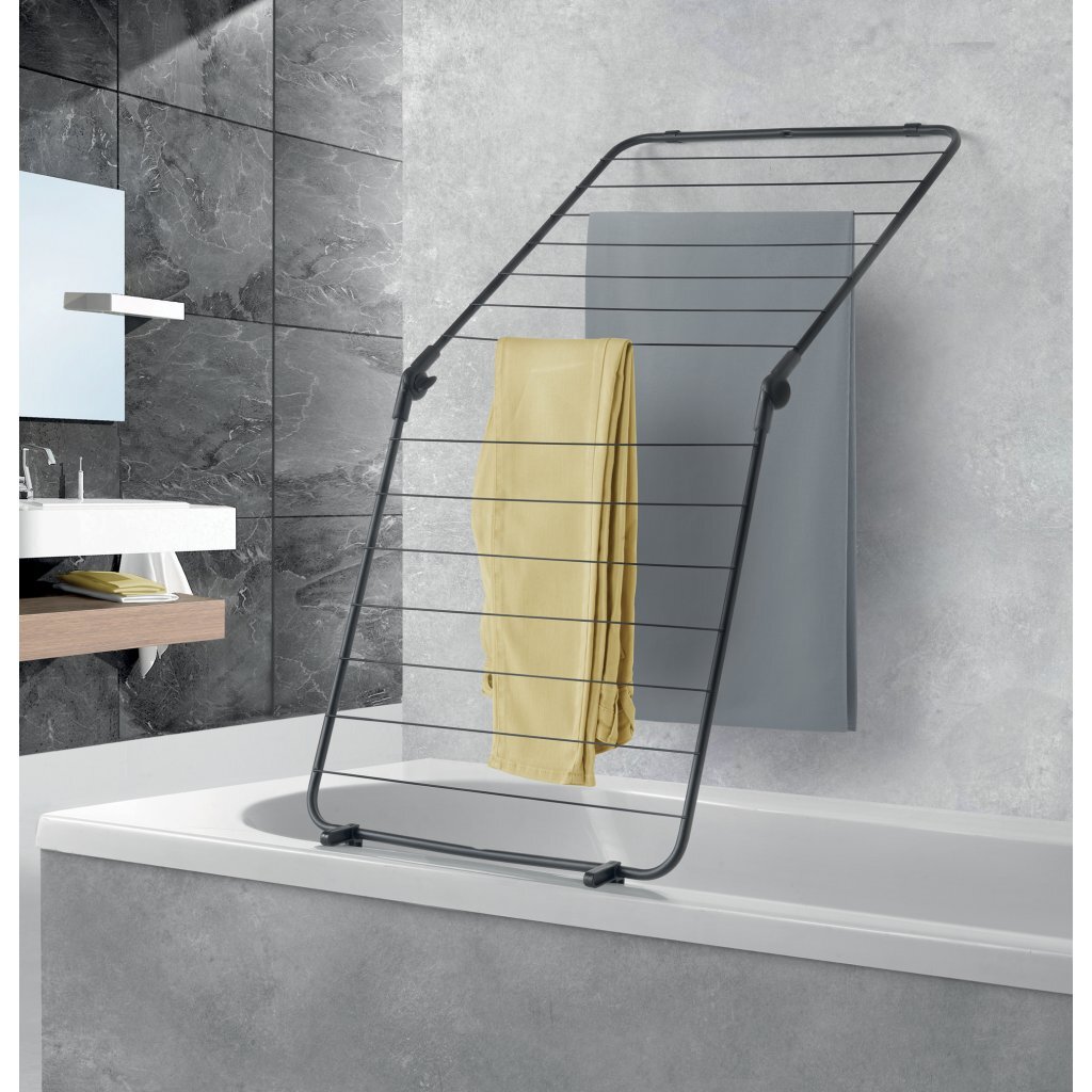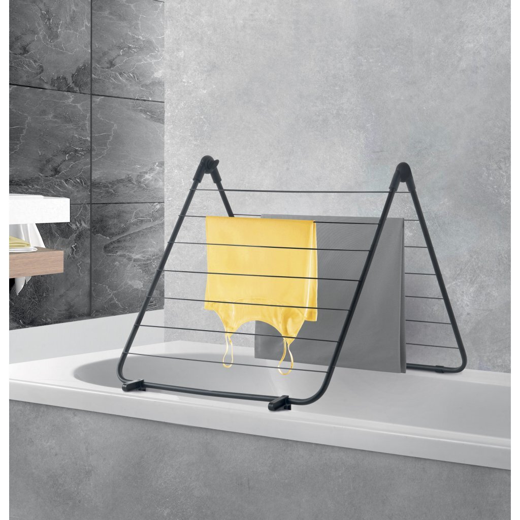 - Dit moduleerbaar droogrek kan op de badkuip liggen om fijne was of wollen truien te drogen, of in driehoekige vorm gebruikt worden