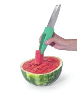 Met de ene kant van demeloensnijder kan de meloen in stukjes gesneden worden, de andere kant fungeert als tang waarmee de stukjes geserveerd kunnen worden.