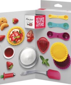 De set bestaat uit een aardbeisnijder en -ontkroner. Daarnaast bijgesloten zijn 4 silicone bakvormen, een siliconen spatel en 3 kunststof maatscheppen.