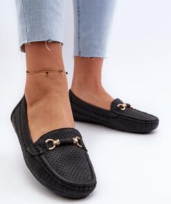 Opengewerkte mocassins voor dames gemaakt van ecoleder. De gouden versiering aan de voorkant geeft ze een uniek karakter. De zachte binnenzool zorgt voor comfort tijdens het gebruik. Deze mocassins zijn perfect voor veel verschillende gelegenheden en maken je styling uniek en stijlvol.