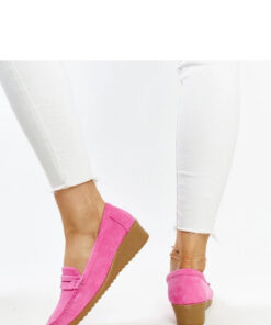 Donkerroze suède moccasins met sleehak Sakena zijn de perfecte combinatie van comfort en modern design. Gemaakt van hoogwaardig suède, met een stevige rubberen zool voor de hele dag comfort. Hun amandelvormige neus voegt elegantie toe, terwijl het lage ontwerp zeer praktisch maakt. Makkelijk aan te trekken, passen ze perfect bij veel verschillende outfits. Ideaal voor vrouwen die comfort en een originele uitstraling waarderen!