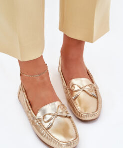 Dames, klassieke mocassins zijn gemaakt van kunstleer. Dit model heeft een decoratief strikje aan de voorkant en veters die zich door de zijkanten van de schacht vlechten. De mocassins zijn geplaatst op een antislip zool. Het zachte voetbed van kunstleer zorgt voor comfort tijdens het dragen van de schoenen. Bovendien is het licht geperforeerd. Je moet ze zeker in je schoenencollectie hebben!