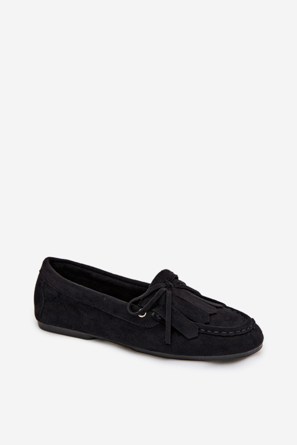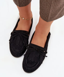 Mocassins voor dames gemaakt van zacht imitatiesuède zien er prachtig uit aan de voet. Aan de voorkant bevinden zich decoratieve franjes en een decoratieve strik die een subtiele, vrouwelijke uitstraling toevoegen. Het interieur is afgewerkt met een zachte binnenzool van imitatieleer, waardoor de moccasins zelfs tijdens een lange dag comfortabel zijn. De platte zool maakt ze ideaal voor zowel werk als wandelingen of ontmoetingen met vrienden.