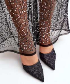 Stijlvolle damesschoenen met hoge hakken versierd met glitterende glitters, die ze een unieke glans geven. Dit model heeft spits toelopende neuzen die de benen optisch verslanken, en een zachte binnenzool van imitatieleer die comfort biedt tijdens het dragen. Deze elegante schoenen zijn perfect voor avondjes uit, feestelijke gelegenheden of oudjaarsavondfeesten, en voegen een unieke charme en klasse toe aan je outfit.