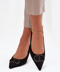 Hoge hakken voor dames gemaakt van kunstsuède. Het model betovert met een klassieke lijn en puntige neus, die de benen optisch verslankt en het silhouet lichtheid geeft. Aan de voorkant van de schoen zit een decoratief detail dat de aandacht trekt en de hele look een uniek karakter geeft, een subtiel accent dat het smaakvolle ontwerp van de schoen benadrukt. Dankzij de stabiele, slanke hak zien de schoenen er prachtig uit aan de voet en zorgen ze tegelijkertijd voor een elegante afwerking van elke outfit. Ideaal voor zowel avondkleding als elegante kantooroutfits.