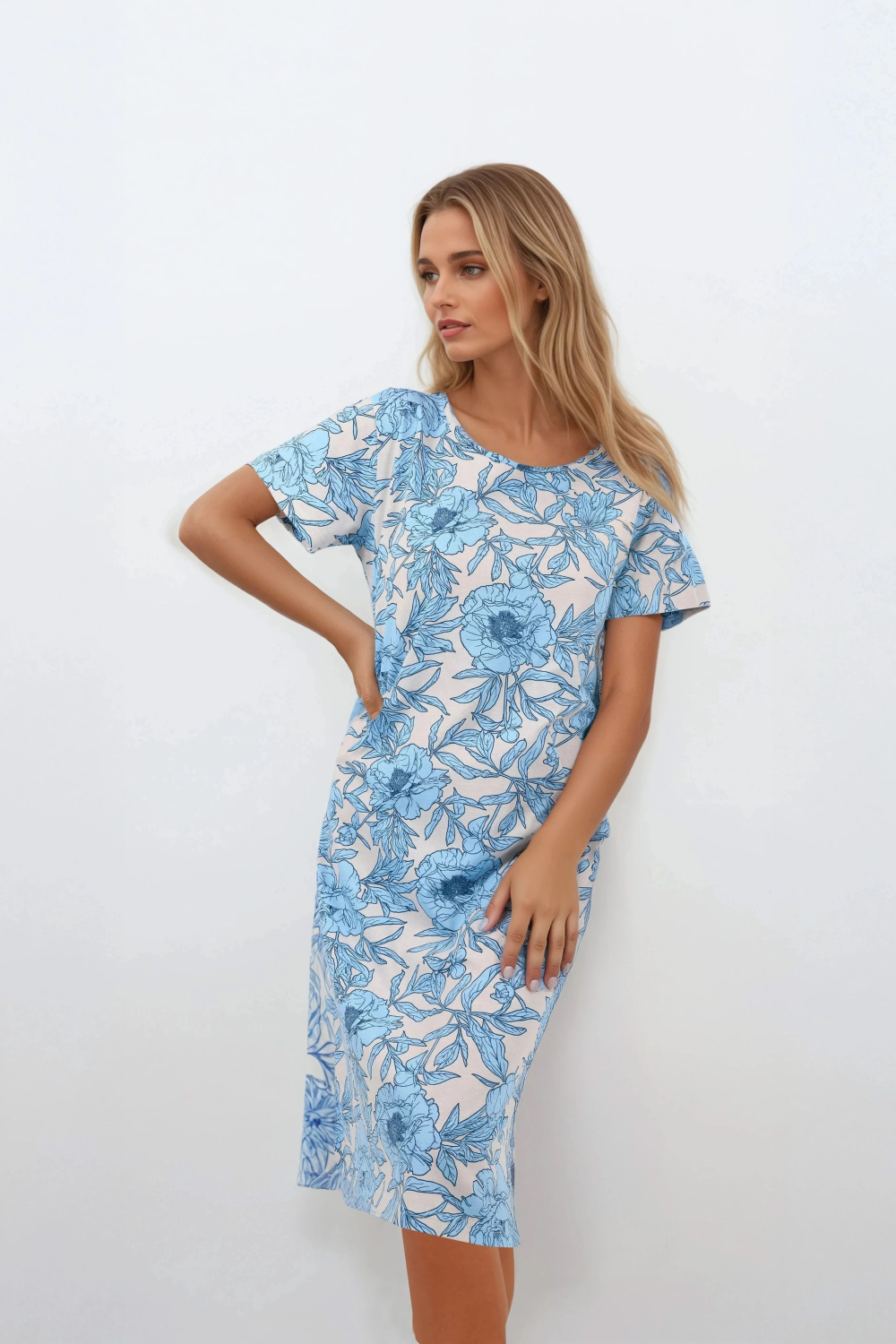 Deze uitzonderlijke nachtjapon combineert comfort, kwaliteit en subtiele stijl, waardoor het een perfecte keuze is voor een rustige en comfortabele slaap. Gemaakt van natuurlijke materialen, is het hypoallergeen en laat het de huid vrij ademen, wat het ook een uitstekende keuze maakt voor mensen met een gevoelige huid. De nachtjapon heeft een ronde halslijn, korte mouwen en een losse, elegante pasvorm die volledige bewegingsvrijheid biedt zonder afbreuk te doen aan de elegante uitstraling. De zachte en tegelijkertijd trendy kleuren en de stof met print geven het een subtiele charme en vrouwelijke uitstraling. Het product is ontworpen en gemaakt in Polen, met grote aandacht voor details. De kwaliteit en veiligheid ervan worden bevestigd door het OEKO-TEX Standard 100-certificaat. Het is de ideale keuze voor vrouwen die comfort, stijl en natuurlijke materialen waarderen.