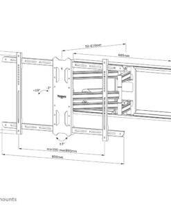 De Neomounts WL40 S-850 BL18 is een full motion wandsteun voor flat screens tot 86″ met een maximaal draagvermogen van 60 kg. Door de veelzijdige kantel- (18°) en zwenktechnologie (35°) creëer je de optimale kijkhoek. Voor de perfecte installatie is niveauverstelling beschikbaar. De WL40 S-850 BL18 heeft een diepte van 5-61 cm en is geschikt voor schermen met VESA gatenpatroon 100 x 100 tot 800 x 400 mm. De wandsteun is voorzien van een Easy-release systeem, waarmee je de tv in een oogwenk kunt bevestigen. Een losse waterpas wordt meegeleverd, evenals een bevestigingssjabloon, om eenvoudige installatie van de steun te garanderen. De steun is voorzien van hoogwaardig stalen kabelmanagement, zodat eventuele losse kabels aan de achterkant van het scherm vastgezet kunnen worden.
