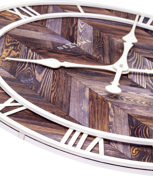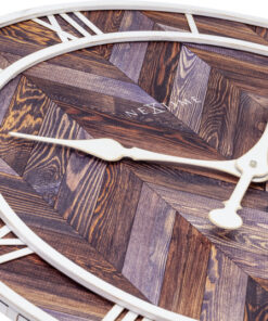 De NeXtime “Roman Vintage” is een grote ronde wandklok ( 58cm). Deze donkerbruine, houten klok heeft een witte metalen index met Romeinse cijfers en elegante witte wijzers. De combinatie van verschillende kwaliteitsmaterialen en een decoratief visgraatpatroon geeft deze klok een speciaal design. De klok is stil en werkt op 1x AA-batterij (niet inbegrepen). ).