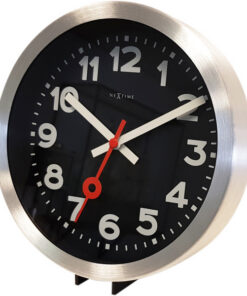 Dit eenvoudige maar toch klassieke ontwerp van de station klok geeft mensen een tijdloos gevoel! Deze nieuwe versie trekt snel de aandacht door de combinatie van een zwarte wijzerplaat, aluminium behuizing en een zeer in het oog springende felrode secondewijzer! De secondewijzer loopt soepel en zorgt ervoor dat dit een stille klok is! Deze klok wordt geleverd met een standaard om deze op tafel of bureau neer te kunnen zetten.