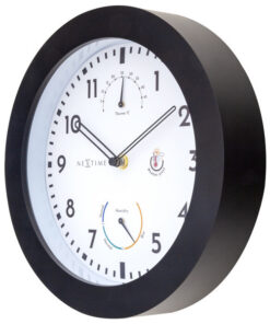 DeNeXtime NE-4319 buitenklok Daisy verteld meer dan alleen de tijd. Deze wandklok heeft namelijk ook een thermometer op de index welke de temperatuur in Celsius weergeeft en geeft de luchtvochtigheid aan. Deze klok heeft opvallende zwarte rand met een witte wijzerplaat en is voorzien van een duidelijke zwarte cijfer en streep index. Het gebruik van extra rubberen ringen om te voorkomen dat het water de kwetsbare delen van de klok bereikt, maakt deze klok bijzonder en weerbestendig. De klok is geschikt voor zowel binnen als buiten en werkt op 1x AA-batterij (niet inbegrepen). Diameter: 25,5 cm.