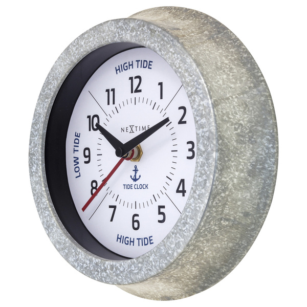 DeNeXtime NE-4321WI Tide getijdenklok is een hele speciale klok. De klok laat niet alleen de huidge tijd zien maar laat ook zien waarneer het hoogwater of laagwater is. Zo volg je binnenshuis wanneer het de perfecte tijd is om naar het strand te gaan om te genieten van een mooie wandeling of om te surfen. Deze getijdenklok heeft een witte wijzerplaat met een marineblauwe index en wijzers. De klok heeft een gegalvaniseerde metalen behuizing en loopt op 1x AA-batterij (niet inbegrepen). Diameter: 22 cm.