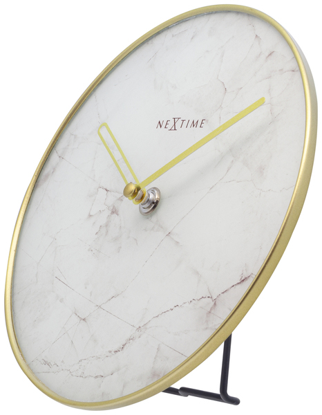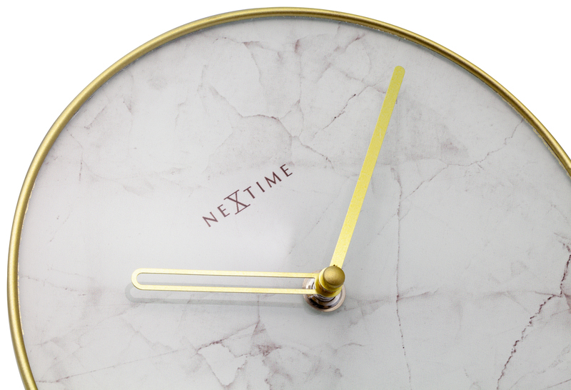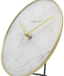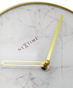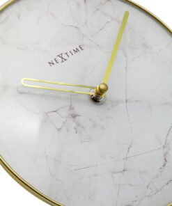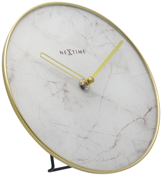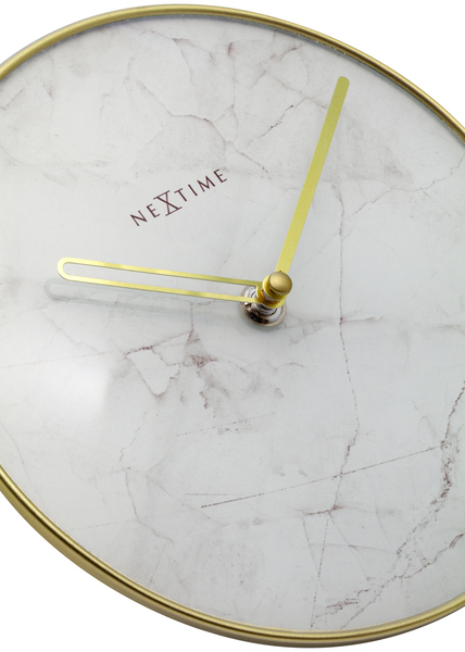 De NeXtime “Marble Table” is een kleine ronde tafelklok (Ø 20 cm) gemaakt van glas en metaal. De combinatie van glas met een witte marmeren print, de gouden wijzers en de slanke gouden metalen rand zorgen voor een elegante en trendy look & feel. Deze klok is stil en werkt op 1x AA-batterij (niet inbegrepen).