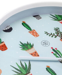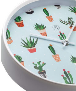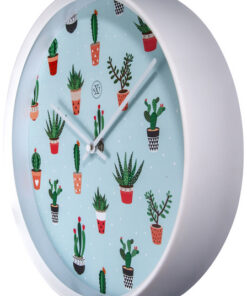 Wandklok kunststof Ø 30 cm. Cactus opdruk op een lichtgroene wijzerplaat. Stil wit uurwerk. Deze klok werkt op 1 AA batterij (niet bijgeleverd).
