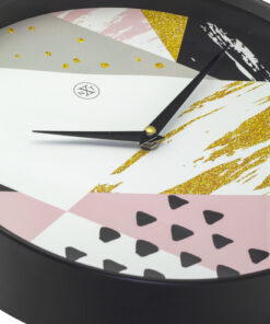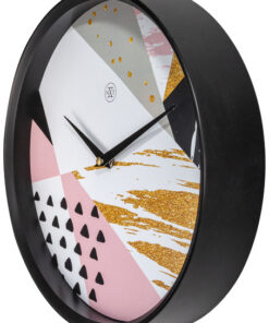 Wandklok kunststof Ø 30 cm. Design opdruk in de kleuren creme, zwart, goud, grijs en roze. Stil zwart uurwerk. Zwarte omlijsting. Deze klok werkt op 1 AA batterij (niet bijgeleverd).