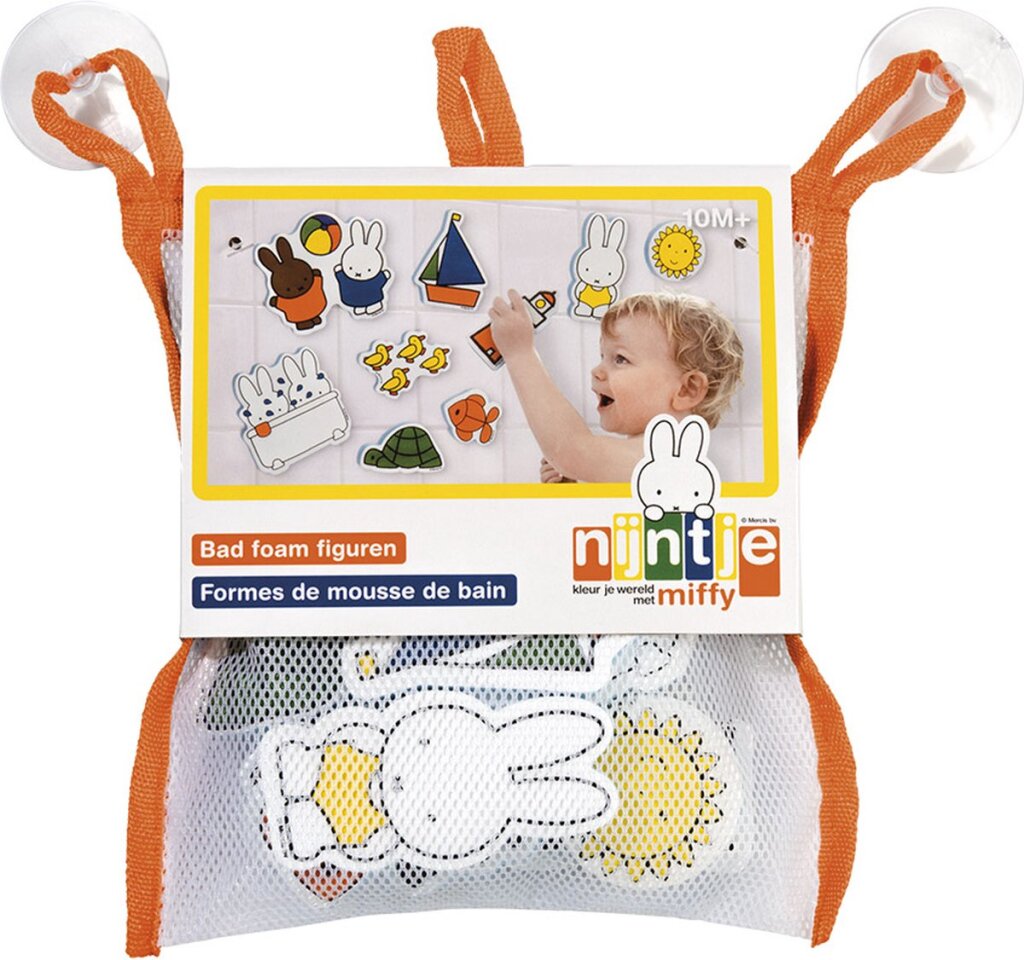 Lekker in bad spelen wordt nog leuker met Nijntje, Nina en allerlei zomerse plaatjes zoals een zonnetje, visje en vuurtoren. Deze foam figuren blijven plakken op de badrand of tegelwand en drijven in het water. Na het spelen gemakkelijk op te bergen in het netje dat met de zuignappen aan een glad oppervlak kan worden vastgemaakt. Geschikt voor kinderen vanaf 10 maanden.