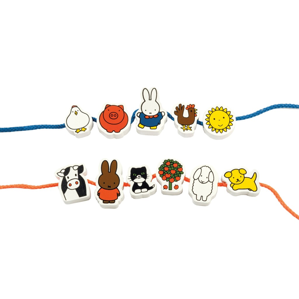 Set van massief houten rijgkralen met afbeeldingen van Nijntje en boerderijdieren. Deze afbeeldingen zijn van de hand van Dick Bruna. De kralen zijn extra groot en met een ruime uitsparing, zodat kleine handjes ze makkelijk aan een veter kunnen rijgen. Inclusief 2 veters om aan te rijgen. Geschikt voor kinderen vanaf 3 jaar
